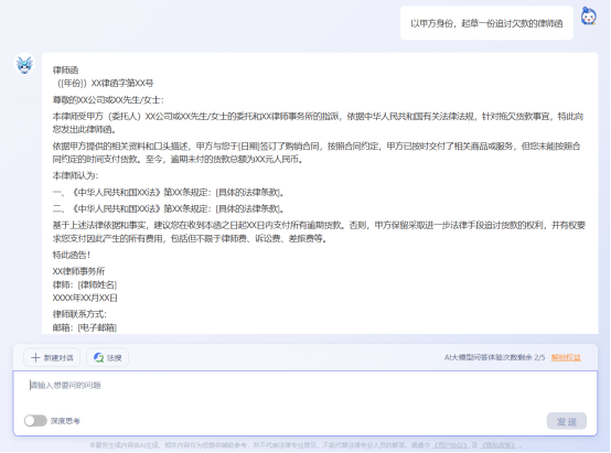 在得理法搜的输入框中,详细输入文书相关信息,如合同当事人信息、纠纷事实经过等,并添加明确指令,例如 “根据上述信息,起草一份商品房买卖合同,需包含质量验收条款和违约责任条款”“以甲方身份,起草一份追讨欠款的律师函”,用准确的指令让得理法搜生成符合需求的文书初稿。