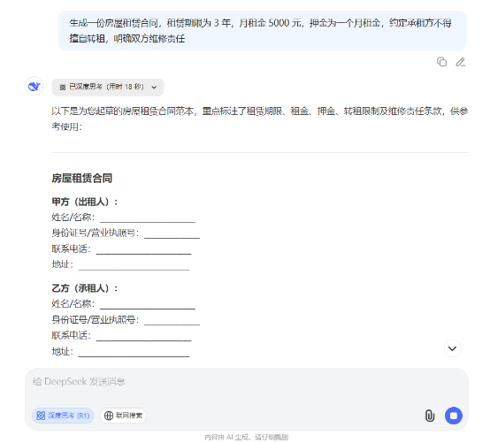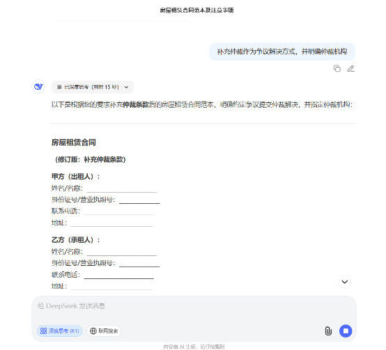 DeepSeek会依据输入内容,生成合同初稿。仔细阅读合同内容,检查条款是否完整、逻辑是否合理、语言是否准确规范。若存在条款缺失、表述模糊等问题,如缺少争议解决方式条款,可向DeepSeek反馈修改意见,输入 “补充仲裁作为争议解决方式,并明确仲裁机构”,通过多次交互让DeepSeek生成更完善的合同版本。
