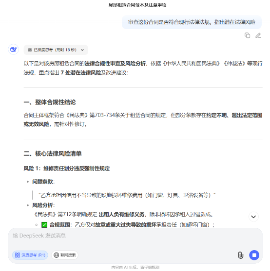 将修改后的合同再次提交给DeepSeek,输入指令 “审查这份合同是否符合现行法律法规,指出潜在法律风险”,利用DeepSeek的法律知识储备,对合同进行合规性检查。根据DeepSeek反馈的风险提示和修改建议,进一步优化合同,确保合同合法有效,降低法律纠纷风险。