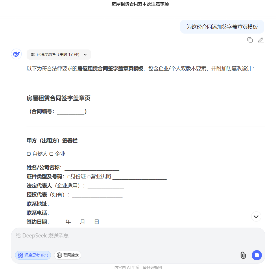 确认合同内容无误后,将最终版本的合同导出保存。若需要添加附件、签署页等内容,可再次向DeepSeek寻求帮助,输入 “为这份合同添加签字盖章页模板”,用DeepSeek生成配套文件。完成后,即可将合同发送给合作方,进行签署流程。
