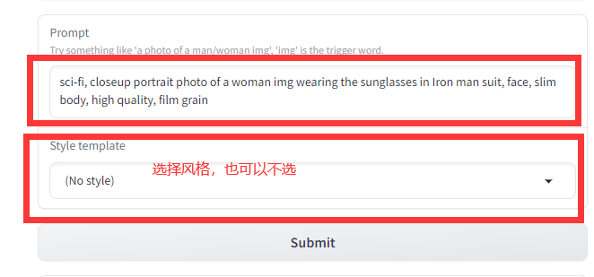 在输入提示词后,您可以选择是否选择一种风格。一切准备就绪后,点击提交按钮生成图像。