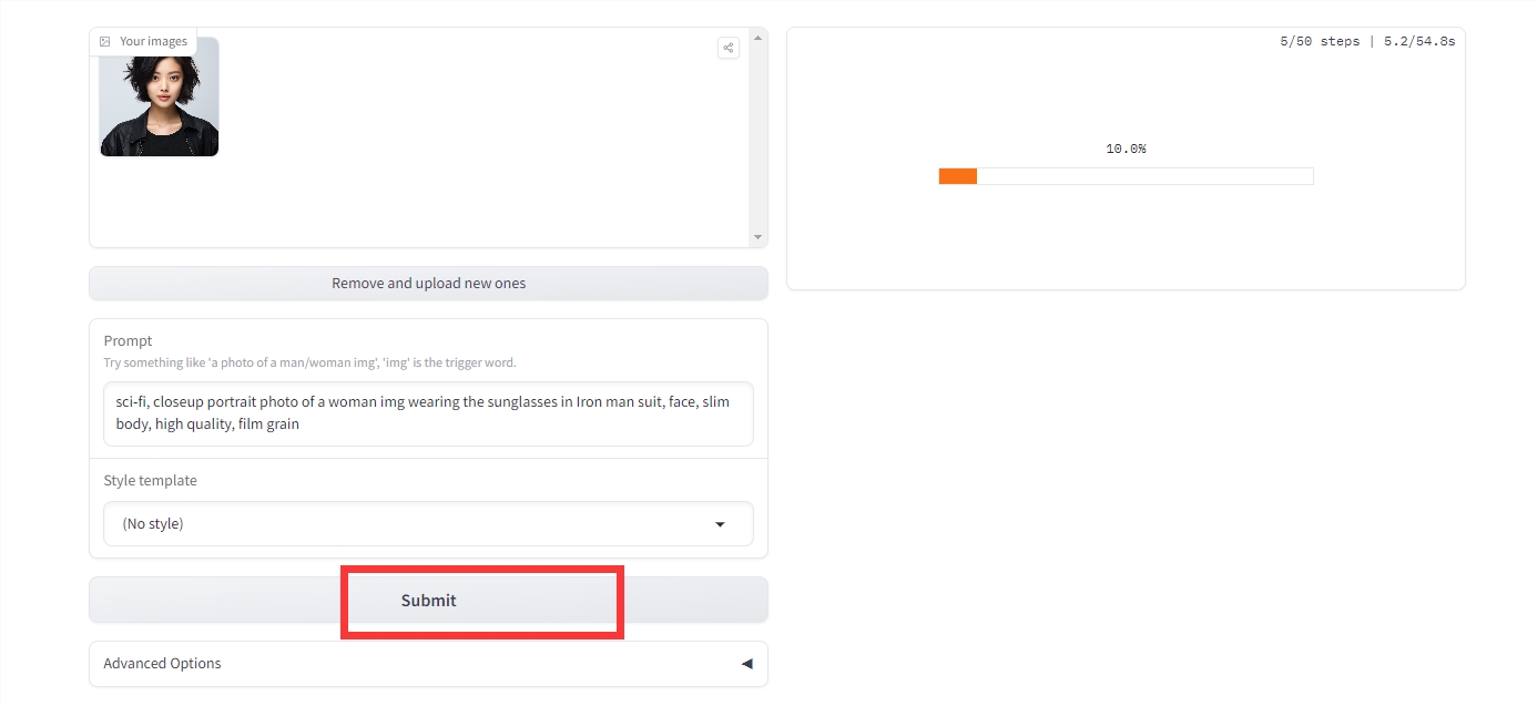 例如,如果我希望她被转变成钢铁侠,我会输入提示词 "科幻,女人的特写肖像照片,戴着钢铁侠头盔的 sunglasses,脸部,苗条的身体,高质量,胶片颗粒感"。