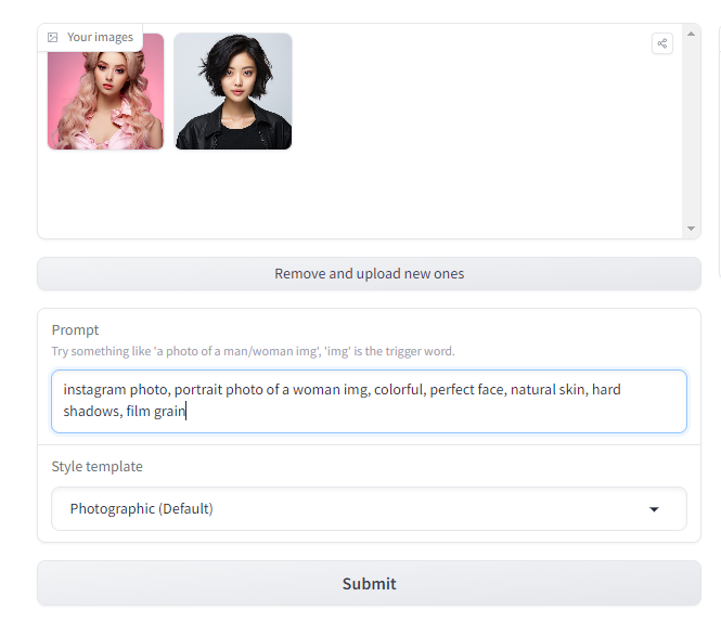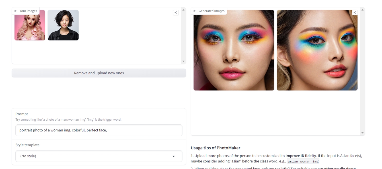 例如,如果我输入“女人的肖像照片 img,色彩斑斓,完美的脸”,你将获得一个新的角色,结合了两个人的面部特征。