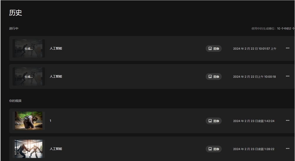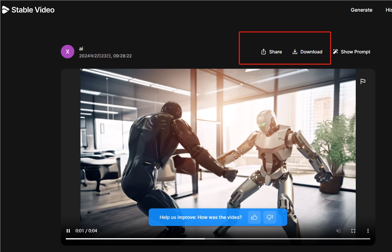 在历史记录中,点击目标视频以分享或下载AI生成的视频。