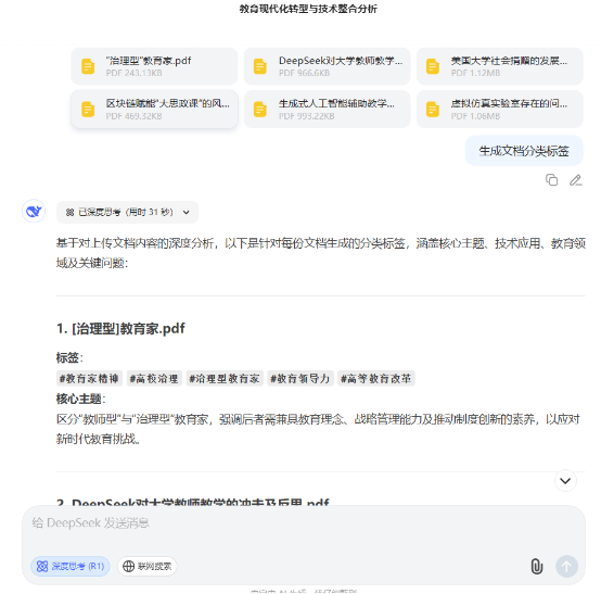 上传完成后,在指令输入框中明确输入需求。例如,使用 “用 DeepSeek 生成文档分类标签”,让 DeepSeek 分析文档内容,自动生成合适的分类标签;若想了解文档核心内容,可输入 “用 DeepSeek 生成文档内容摘要” ,DeepSeek 会迅速提炼出文档的关键信息。